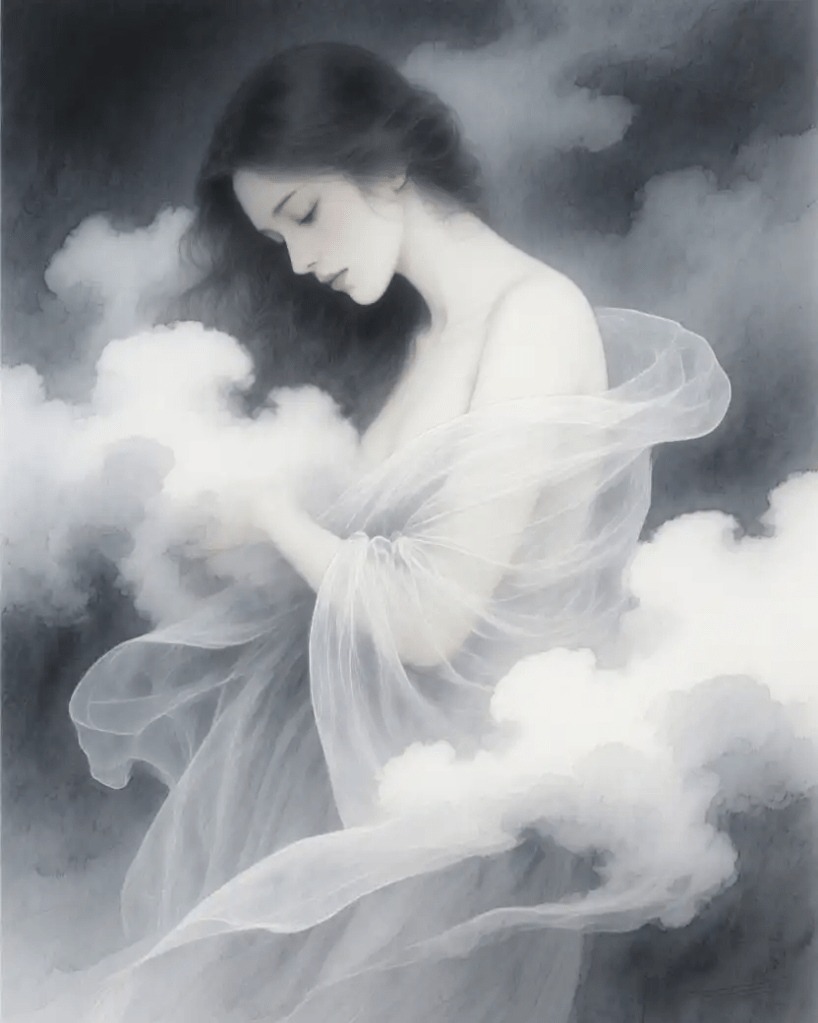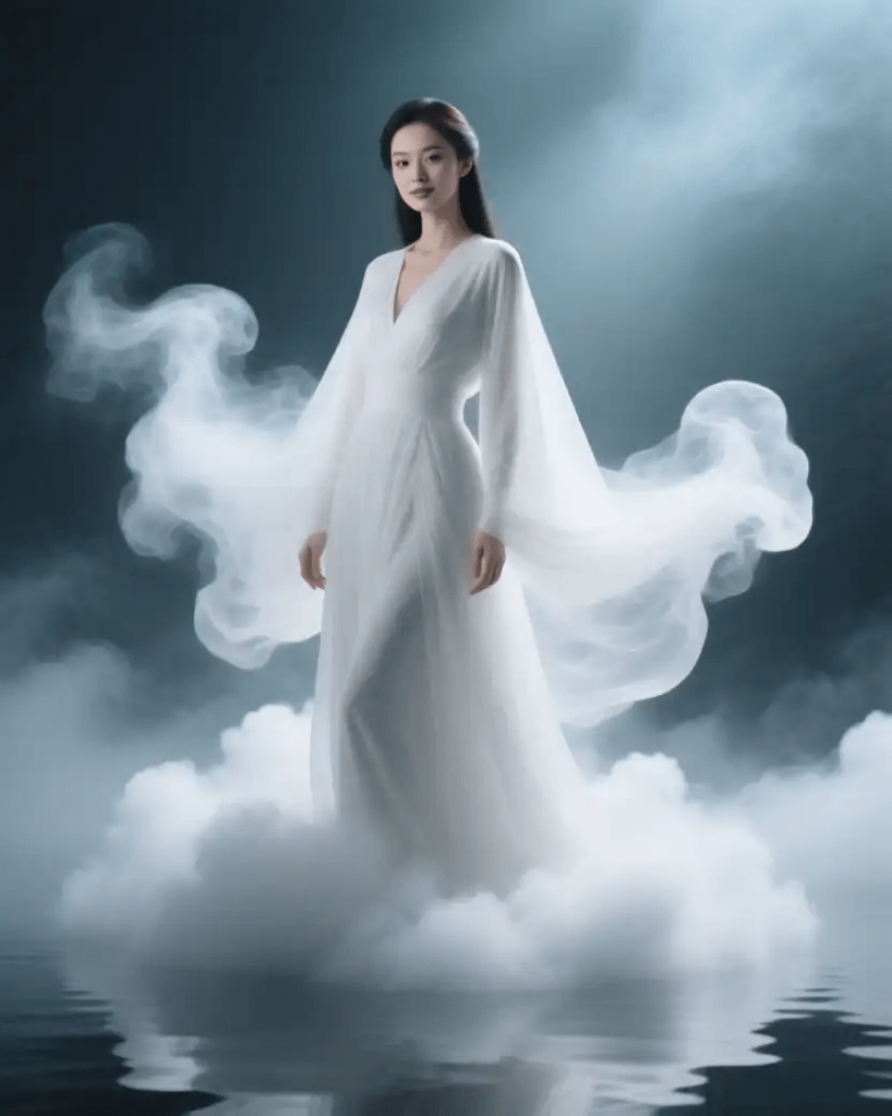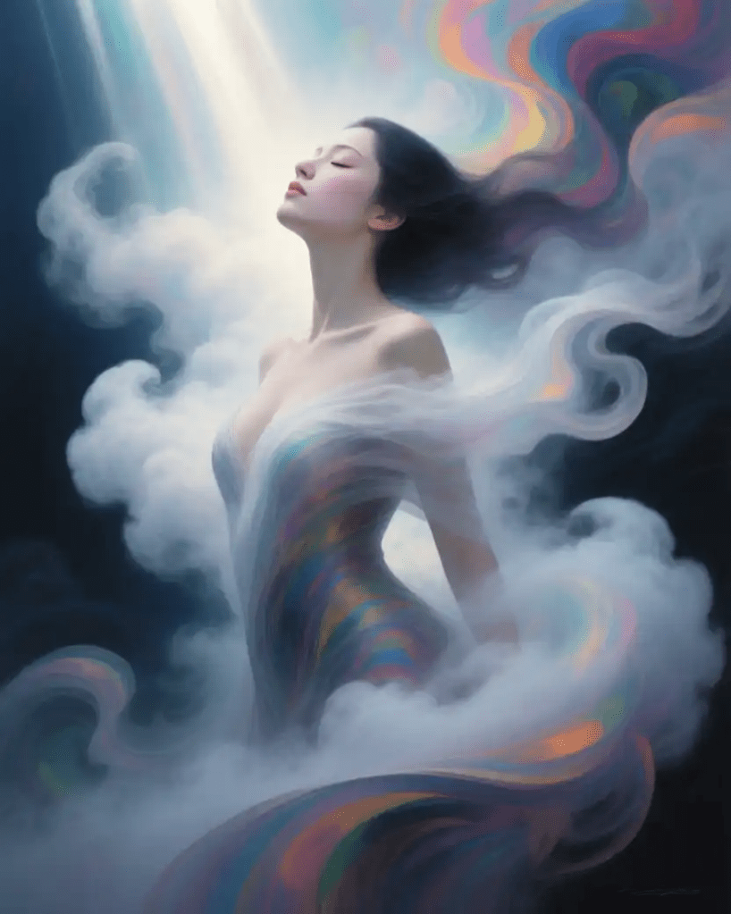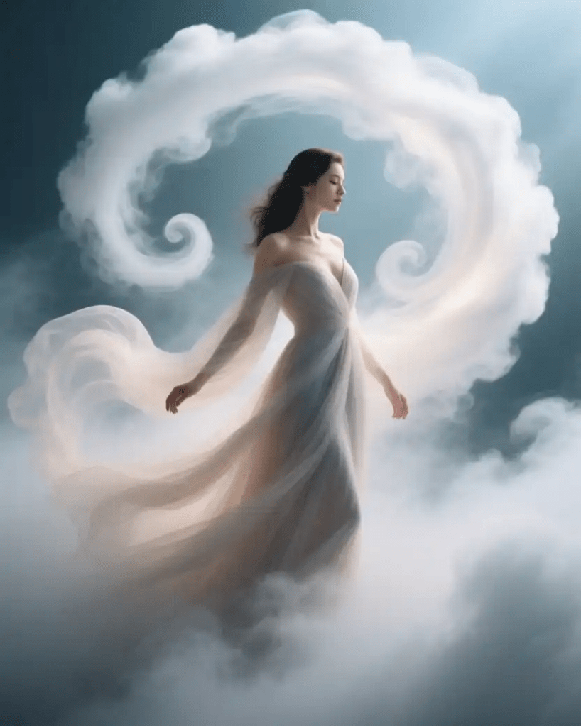 A mesmerizing beauty, blended with the divine smoke, adding a mysterious grace.