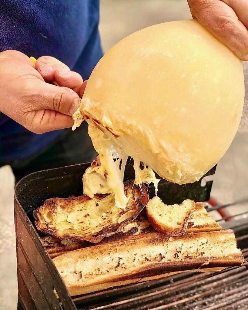 Si narra che l’usanza sia nata per necessità, lungo le vie della transumanza, quando le greggi si spostavano stagionalmente tra i pascoli. I pastori, veri custodi delle tradizioni casearie, portavano con sé le forme di caciocavallo, alimento essenziale. Immagina una notte fredda, un bivacco sotto un cielo stellato nel cuore dell’Alto Molise. I pastori si scaldavano attorno a un fuoco ardente e, per proteggere le preziose forme, le appendevano al collo con una corda, sospese in alto, lontano da umidità e animali. Una notte, però, il calore della brace fu più intenso del solito. Una forma di caciocavallo, troppo vicina, cominciò a sudare, a fondersi lentamente, lasciando cadere sulla brace gocce di pasta filante che si trasformavano in un profumo irresistibile di burro e latte. Curiosi, i pastori raccolsero la pasta fusa con la punta del coltello e la spalmarono sul pane casereccio abbrustolito: fu una rivelazione! Il formaggio, scaldato in quel modo lento e scenografico, perdeva parte della sua salinità e si trasformava in una crema burrosa e dolcissima, capace di esaltare la pienezza del suo sapore, esaltato dal fumo e dalla semplicità del pane. Da quel momento, l’”impiccagione” divenne un rito, un segreto custodito gelosamente, portato poi nelle sagre di paese dove è diventato l’attrazione principale.